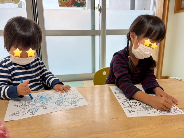 ぬりえを用意すると、それぞれ好きなキャラクター・好きな色を選んで塗り始めるお子さん達☆