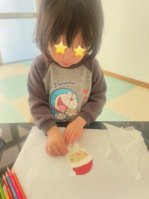 お花紙を丸めて袋に入れたり、可愛らしいサンタとトナカイの顔を描いて作ってくれました♪