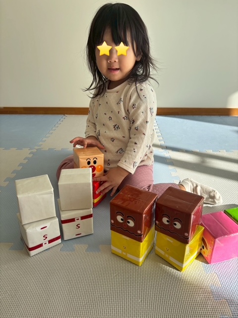 『アンパンマンで遊ぶ?』と、手作り積み木遊びへ誘うと