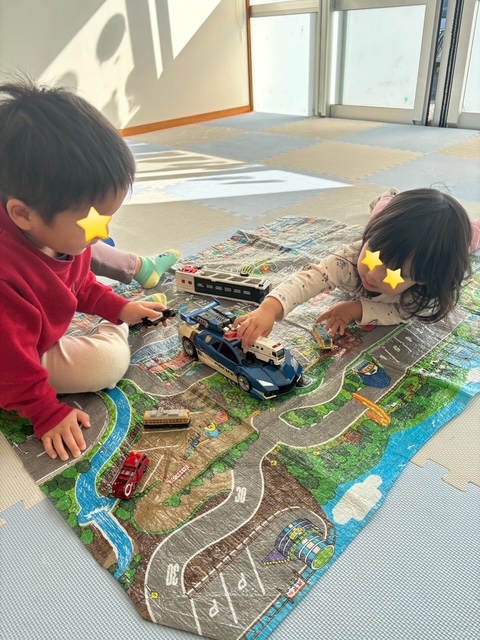 男の子はキャリアカーに車を乗せたり、大きいパトカーを走らせて