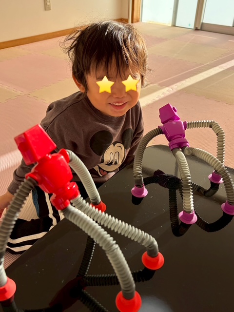 2歳の男の子、入室後は引っ張ると手足が伸びるロボット人形に興味津々♡