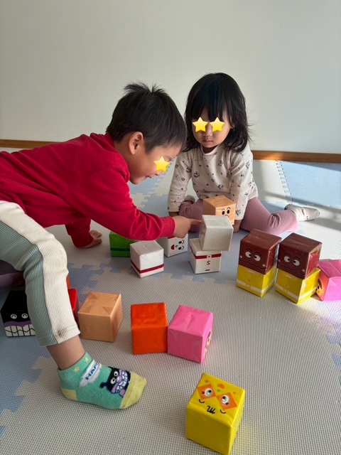 4歳の男の子も仲間入りし、誰が1番高く積めるか競ったり