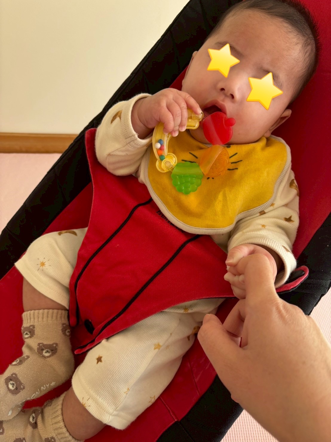 機嫌よくバウンサーにユラユラ揺れながら、先生の指をニギニギ☻