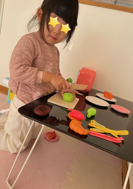 入室後は、大好きなおままごとに夢中で