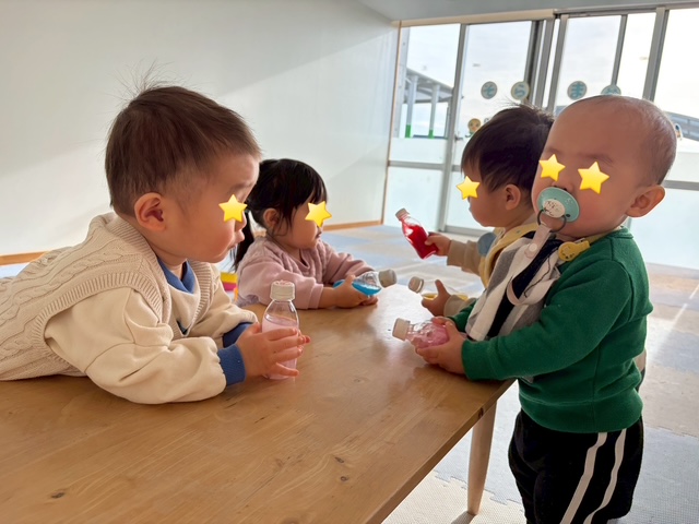 色水の入ったペットボトルを渡すと『なにこれ~?ちょうだい!ちょうだい☻』といった感じで駆け寄り