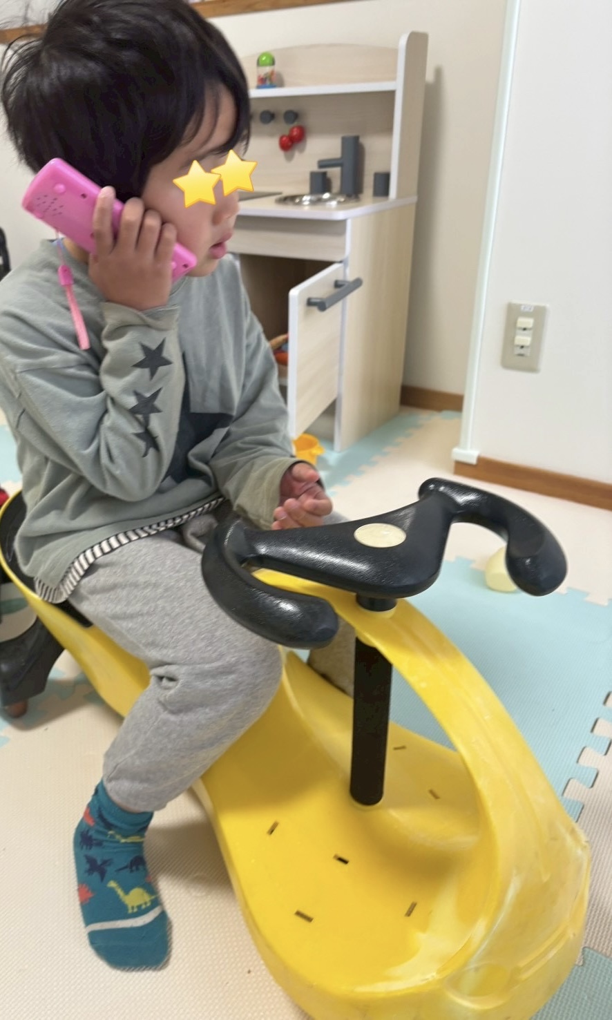コンビカーに乗りながら、忙しそうに電話をしていた男の子❢