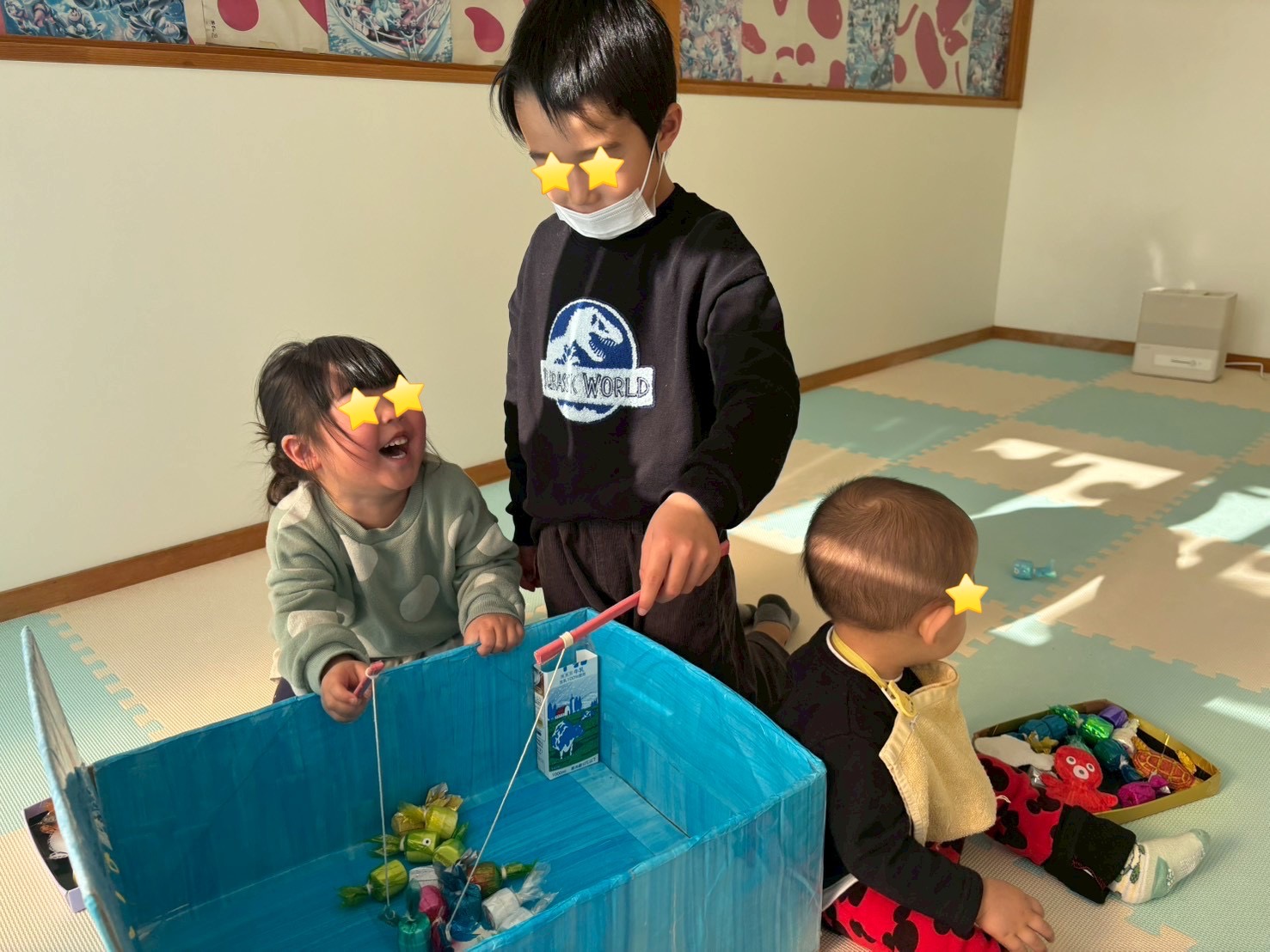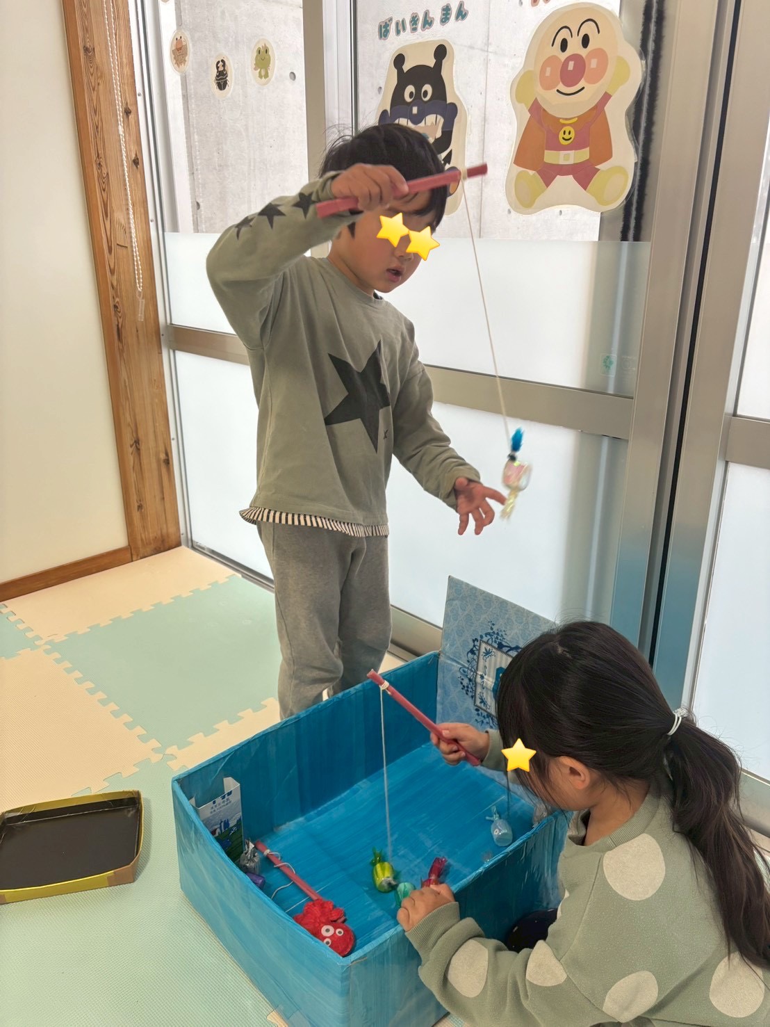 さかな釣りでは『釣れた!釣れた!』と釣り竿を使って上手に釣り、大喜びの2人の間に