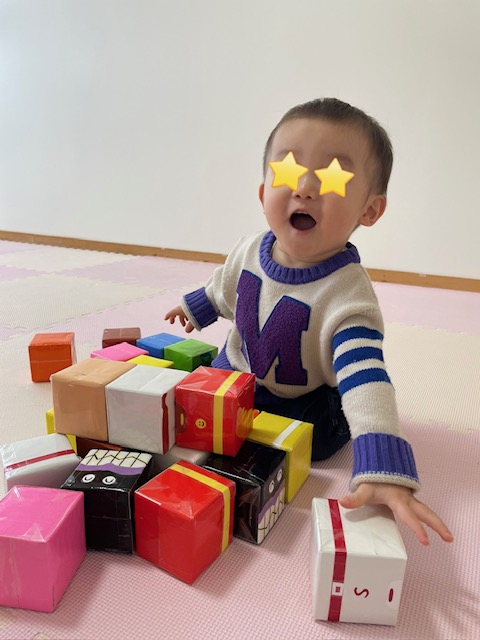色々な玩具に興味津々で、アンパンマンの積み木を用意すると