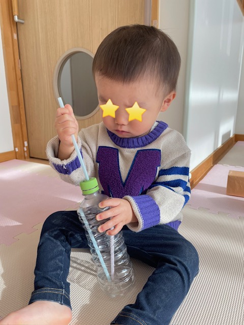 全て入れ終わると、保育士に手伝ってもらいながらキャップを開けてストローを出し