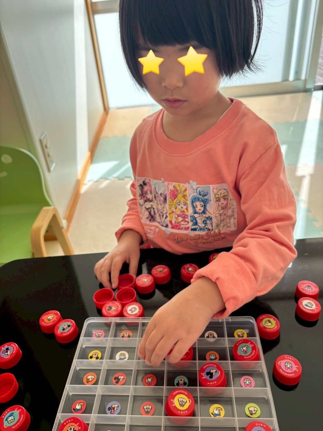 キャップパズルでは、同じ絵柄・同じ色のシールを合わせていきます♪