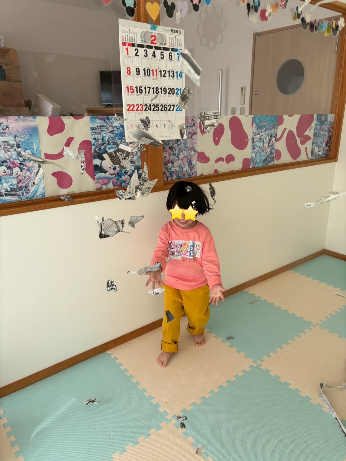 新聞紙遊びでは、細長くちぎって長~い長いヘビを作ったり