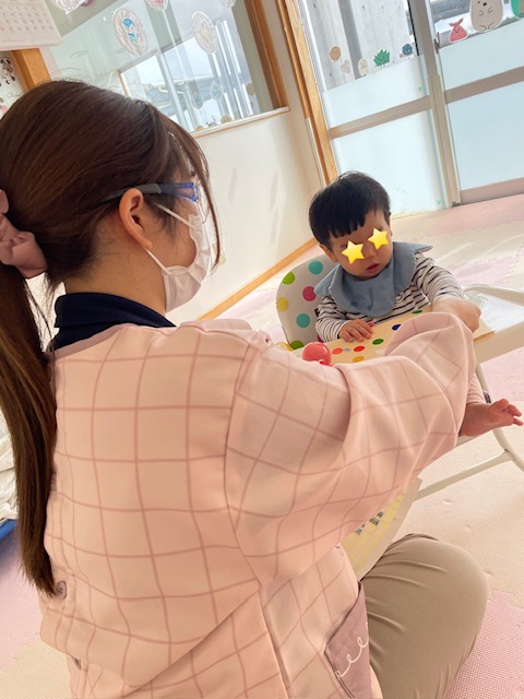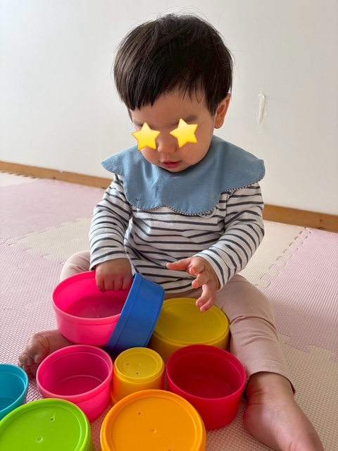 保育士が積み上げて見せると、同じように積み木を手に取って