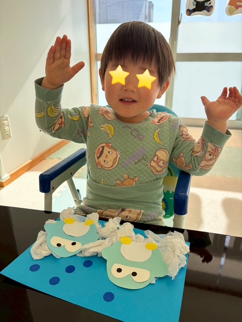 可愛いペンギンさんが完成すると『せんせー☺︎』と、お隣の部屋の保育士にも嬉しそうに見せてくれました♡