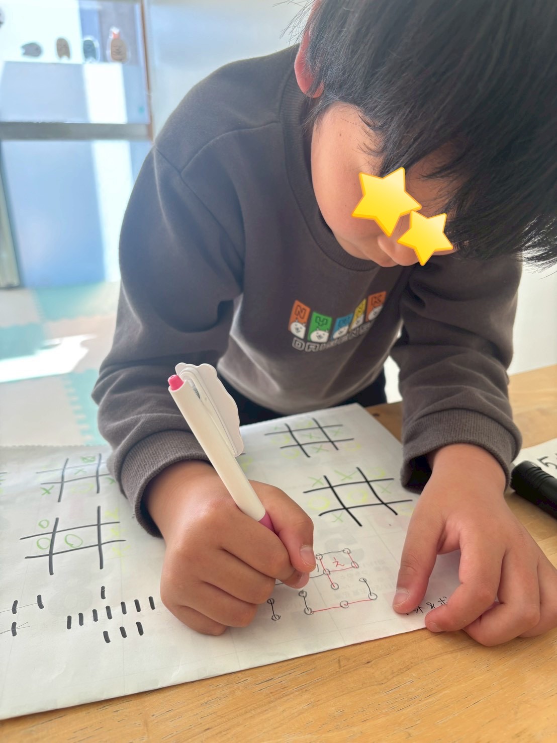 少し体を動かした後はお勉強をしたり、〇✖ゲームや棒消しゲーム・ドット&ボックスなども楽しみました♪