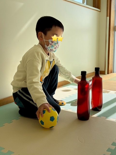 的当てゲームを提案すると、ボールを蹴ってピン倒しに挑戦です!