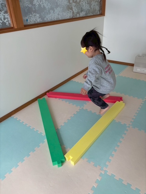 ソフトブロックの平均台を、自分の好きな形に繋げて遊びました☆