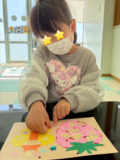 折り紙を小さく千切って、いちごの台紙に丁寧に貼り付けたり