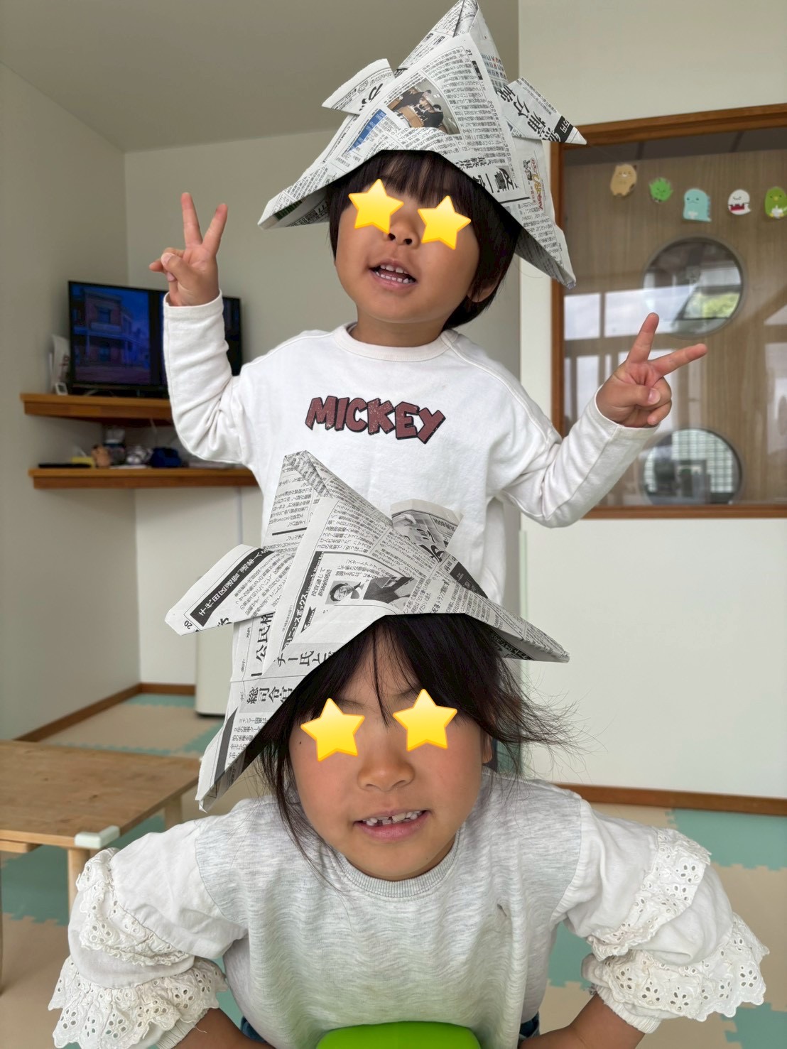 姉弟のお子さん達、今日は新聞紙を使って兜を作りました☆