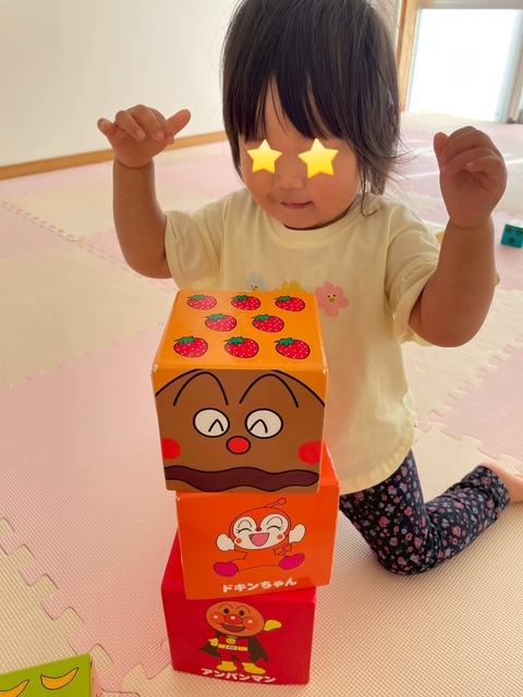 アンパンマンの積み木では、好きな順番で積み重ねていき