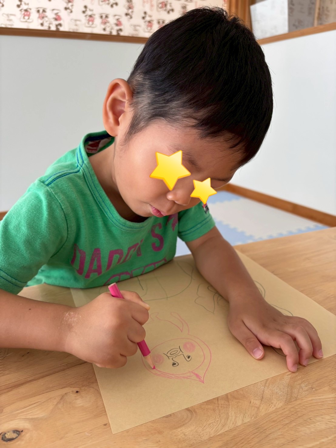 3歳の男の子、今日は大好きなこびとづかん(カクレモモジリ)の絵を先生に描いてもらい