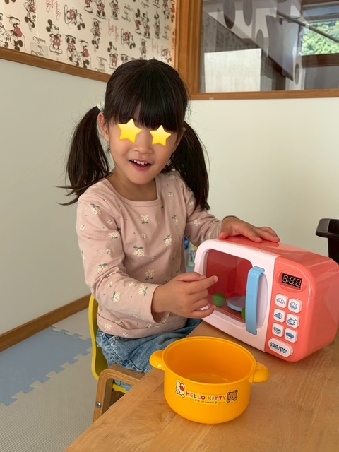 早速おままごとで遊びはじめると、電子レンジの使い方がわからない妹さんに
