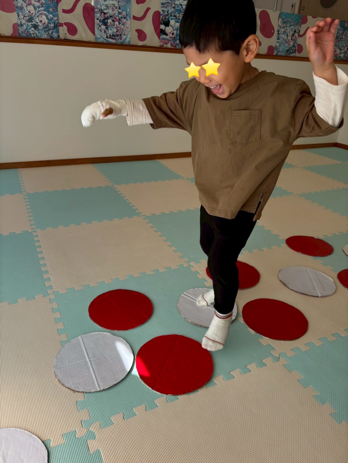 お部屋の中では、赤と白のボードを使ってケンケンパ!を楽しみました☆