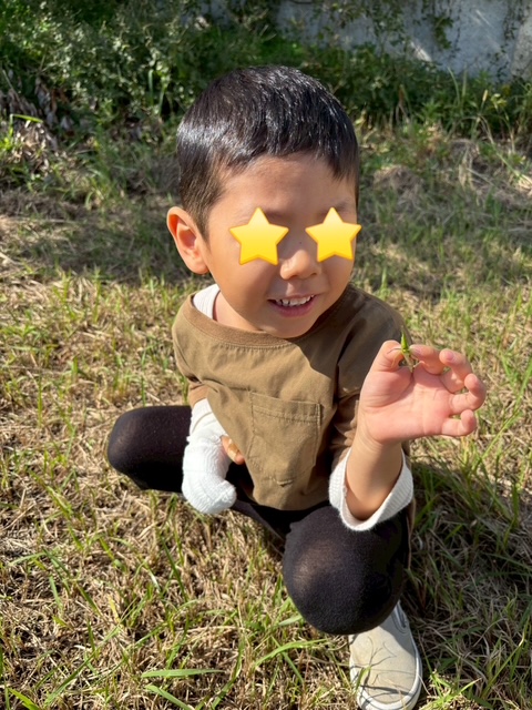バッタやカマキリを見つけることが出来て、とても嬉しそうな男の子♫