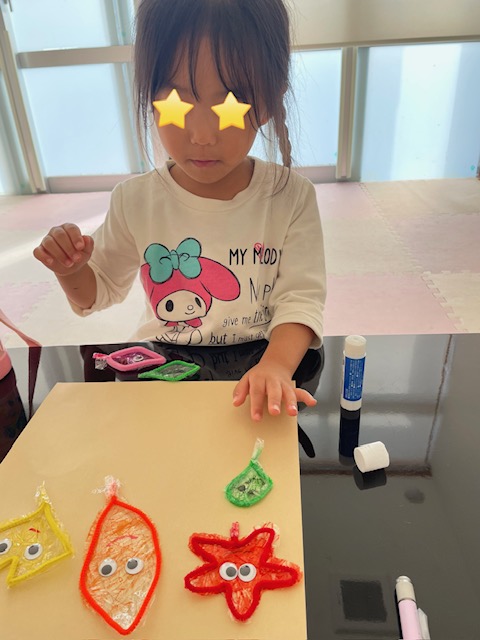 色塗りしたラップに、落ち葉の形に整えたモールをペタッと貼りました♡