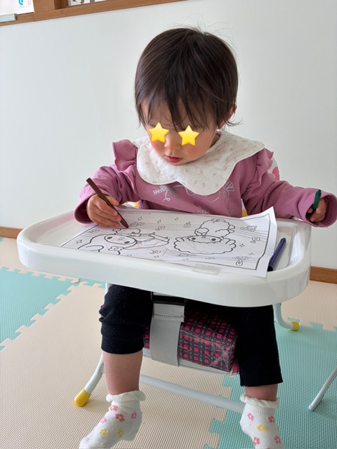 そばでじっと見ていたので、女の子にもぬりえを用意すると