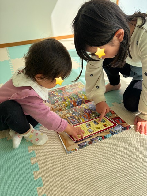 2人仲良く、カーズの絵探し絵本に夢中な場面も…☺︎