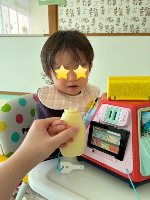 別室で過ごす1歳の女の子は、保育士が用意した手作りマラカスに
