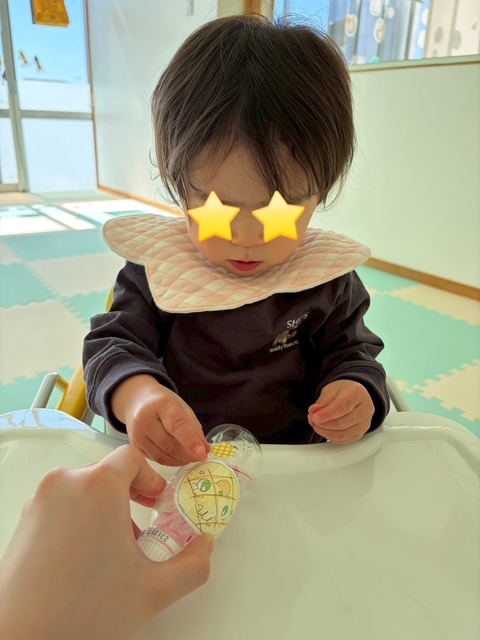 自ら容器を押してみたり、難しいと『やって~!』といった感じでマヨネーズを保育士に渡し