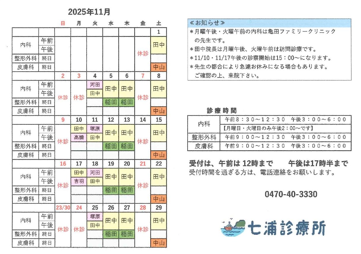 11月診療カレンダー(内科・整形外科・皮膚科)