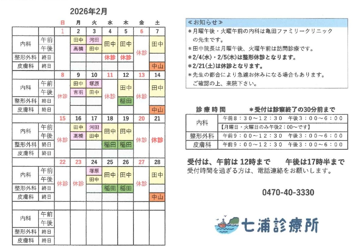 2月診療所カレンダー(内科・整形外科・皮膚科)